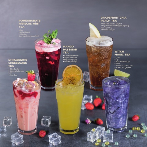 GRapeFRUIT CHIA Pomegranate PEACH TEA H b scus M nt Tea • veya Siyah Çay • • • MANGO PASSSION TEA WITCH MAGIC TEA • • Çilek Strawberry • Liçi Cheesecake • • • Soda Tea • • • Süt • Siyah Çay