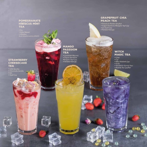 GRapeFRUIT CHIA Pomegranate PEACH TEA H b scus M nt Tea • veya Siyah Çay • Nar • • • MANGO PASSSION TEA WITCH MAGIC TEA • • Çilek Strawberry • Cheesecake • • • Soda Tea • • • Süt • Siyah Çay