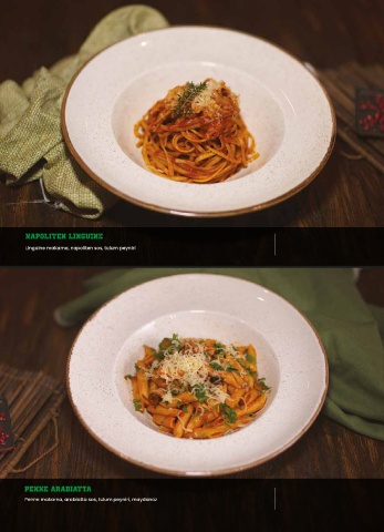 Linguine makarna, napoliten sos, tulum peyniri Penne makarna, arabiatta sos, tulum peyniri, maydanoz