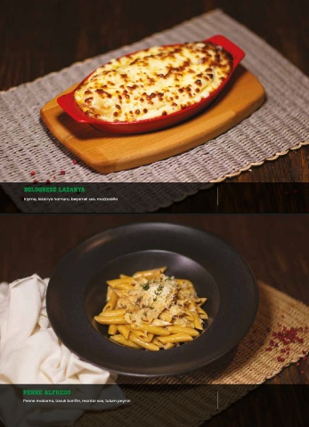 Kıyma, lazanya hamuru, be amel sos, mozzarella Penne makarna, tavuk bonfile, mantar sos, tulum peyniri