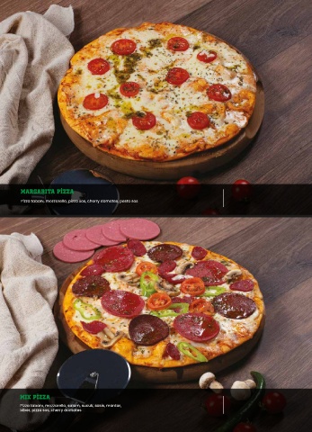 Pizza tabanı, mozzarella, pizza sos, cherry domates, pesto sos Pizza tabanı, mozzarella, salam, sucuk, sosis, mantar, biber, pizza sos, cherry domates