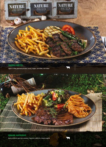 Izgara köfte, parmak patates, lava , soğan, domates, sivri biber Dana antrikot, parmak patates, linguine makarna, karı ık ye illik