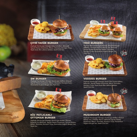 ÇITIR TAVUK BURGER TRIO BURGERS SW BURGER VEGGIES BURGER , KÖZ PATLICANLI MUSHROOM BURGER OTTOMAN BURGER
