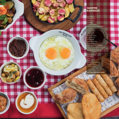 SERPME KAHVALTI Beyaz Peynir, Tulum Peyniri, Çeçil Peyniri, Dereotlu Peynir, Smetana, Siyah Zeytin, Çilek Reçeli, Portakal Reçeli, Bal Kaymak, Simit, en az İKİ KİŞİLİK SERVİS EDİLİR