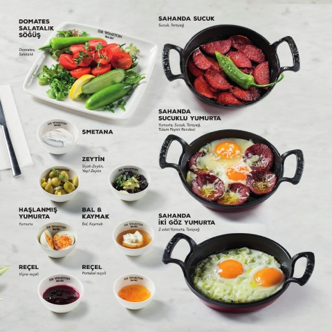 DOMATES SAHANDA SUCUK SALATAlık Söğüş SAHANDA SUCUKLU YUMURTA Smetana ZEYTİN Siyah Zeytin, HAŞLANMIŞ BAL & YUMURTA KAYMAK SAHANDA İKİ GÖZ YUMURTA Yumurta Bal, Kaymak REÇEL REÇEL Portakal reçeli