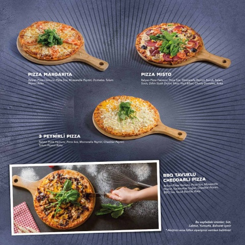 PIZZA MARGARITA PIZZA MISTO 3 PEYNİRLİ PIZZA BBQ TA VUKLU CHEDDARLI PIZZA