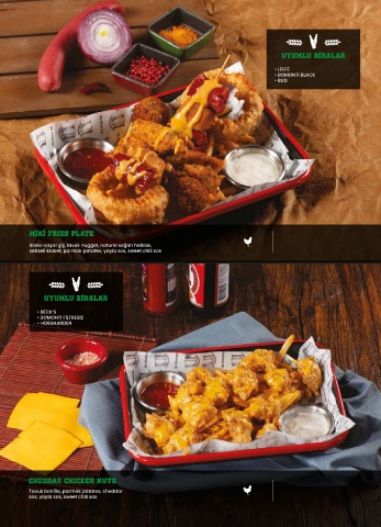 Sosis-ka ar i , tavuk nugget, naturel soğan halkası,