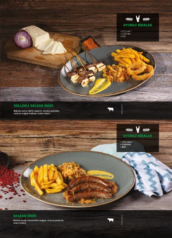 • EFES MALT • CORONA • BUD Balkan sosis, hellim peyniri, churos patates, naturel soğan halkası, soslu marul • EFES MALT • CORONA • BUD Balkan sosis, karamelize soğan, churos patates, soslu marul