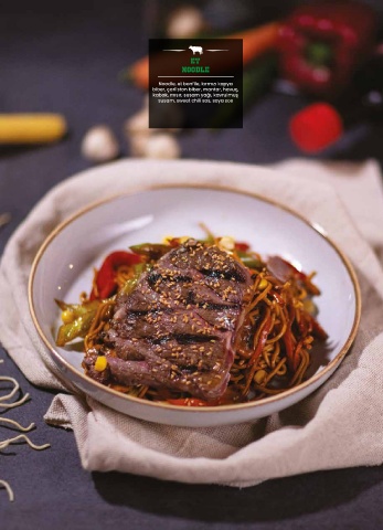 ET Noodle, et bonfile, kırmızı kapya biber, çarliston biber, mantar, havuç, kabak, mısır, susam yağı, kavrulmu susam, sweet chili sos, soya sos